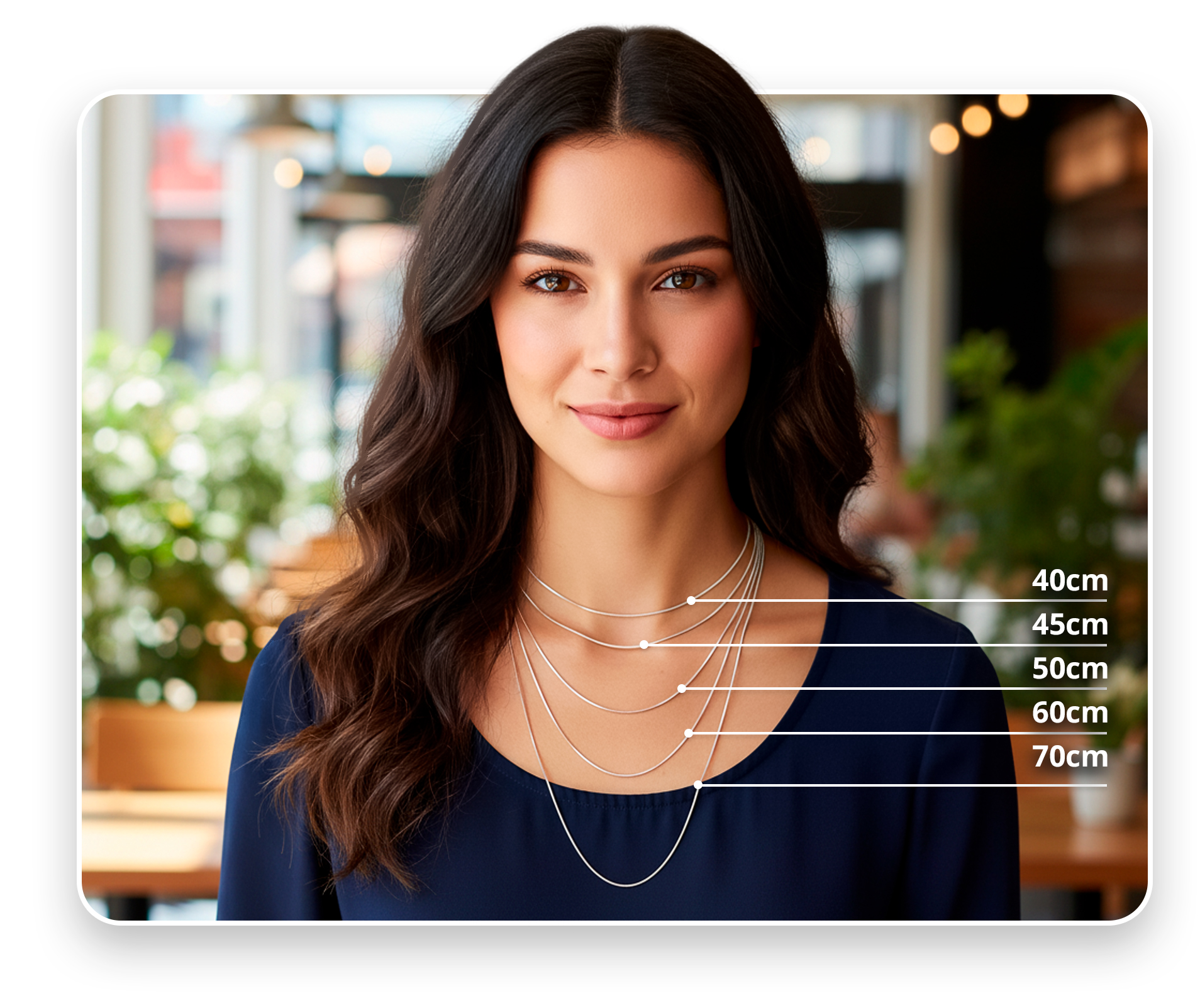Cada pessoa tem um estilo único, e o tamanho da corrente faz toda a diferença no resultado final. Para ajudar você a escolher, criamos esta referência com os comprimentos mais utilizados: 40cm, 45cm, 50cm, 60cm e 70cm.